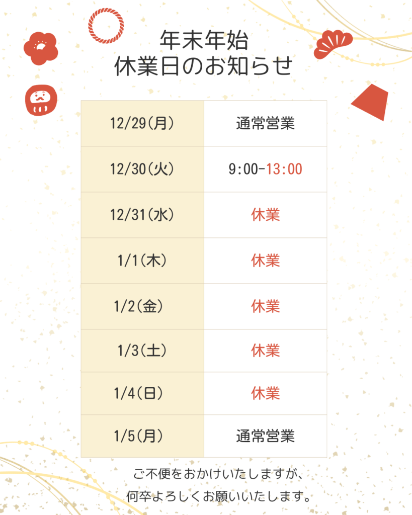 年末年始休業日のお知らせ